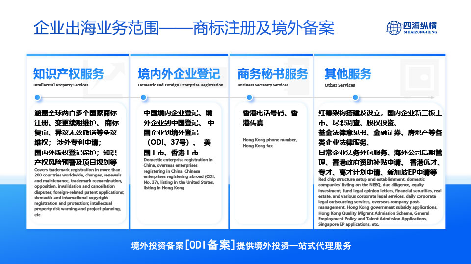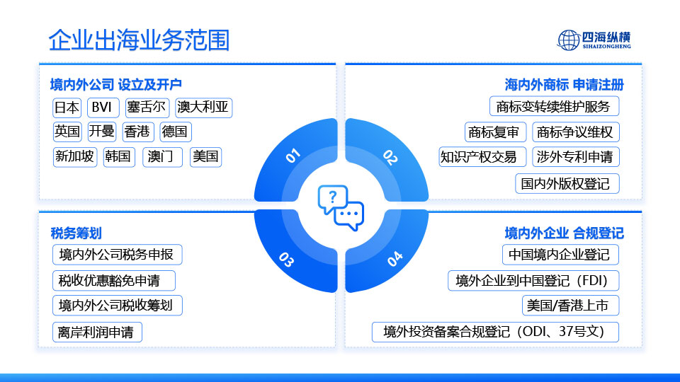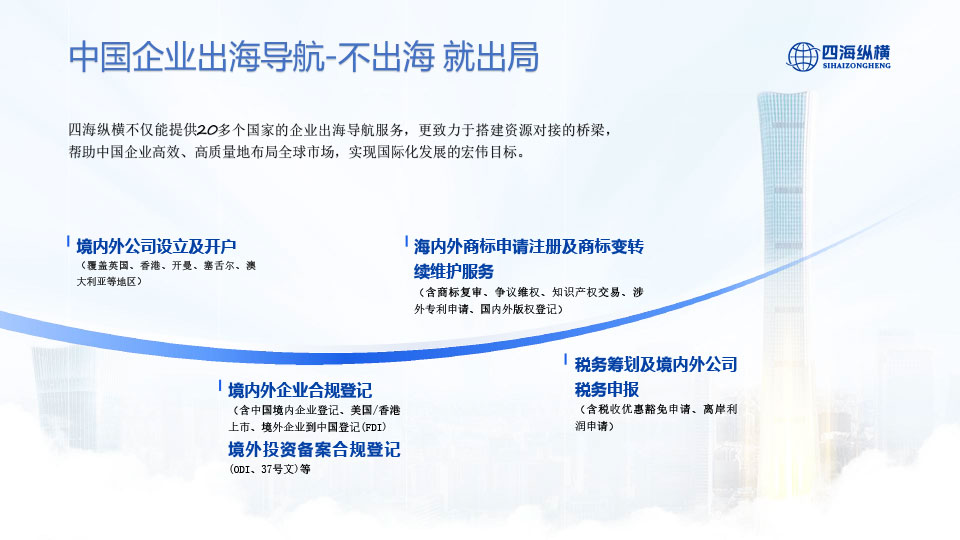 四海纵横为企业提供20多个国家的出海导航服务,更致力于搭建资源对接的桥梁,帮助中国企业高效、高质量地布局全球市场,实现国际化发展的宏伟目标。
