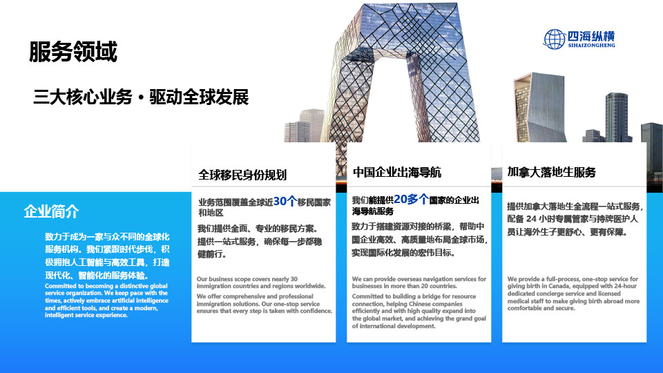 北京四海纵横出入境服务有限公司,致力于成为一家与众不同的全球化服务平台。我们紧跟时代步伐,积极拥抱人工智能与高效工具,打造现代化、智能化的服务体验。